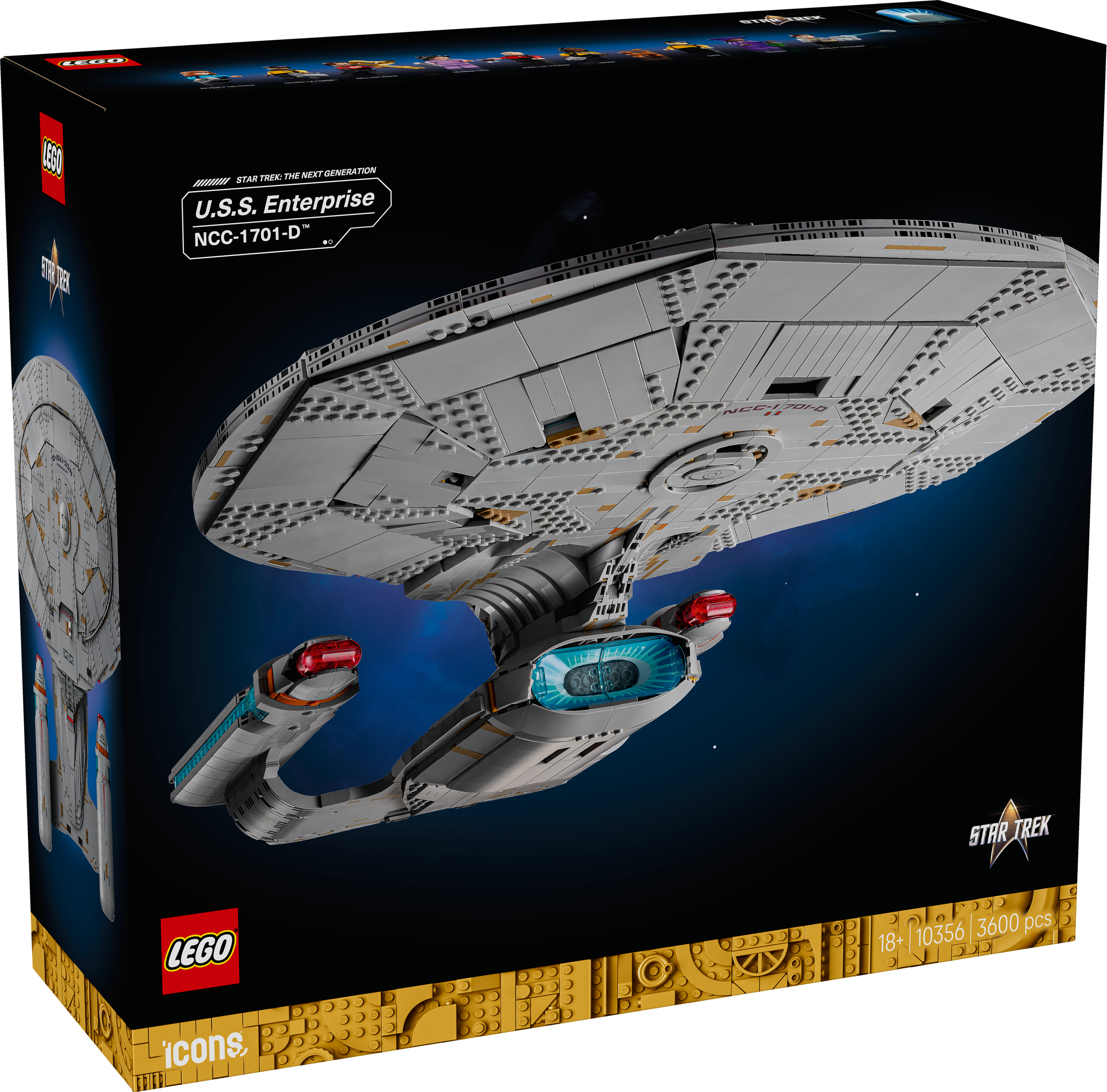 Set course for a creative voyage with the LEGO® Icons Star Trek: U.S.S. Enterprise NCC-1701-D™ (10356) set for adults. Build a highly detailed replica of Starfleet’s legendary flagship complete with a detachable command saucer, secondary hull, warp nacelles with distinctive red and blue detailing, an opening shuttlebay, 2 mini shuttlepods and an angled display stand with a schematic and ship statistics. Includes 9 minifigures with themed accessories and a minifigure-display tile with Star Trek: The Next Generation branding. Characters include Captain Jean-Luc Picard, Commander William Riker, Lieutenant Worf, Lieutenant Commander Data, Dr. Beverly Crusher, Lieutenant Commander La Forge, Counselor Deanna Troi, Bartender Guinan and Wesley Crusher. Accessories include a teacup, trombone with a stand, a phaser, tricorder, engineering case, PADD, bottle, portable tractor beam generator and a cat figure. Find 3D building instructions in the LEGO Builder app. Set includes 3,600 pieces.
