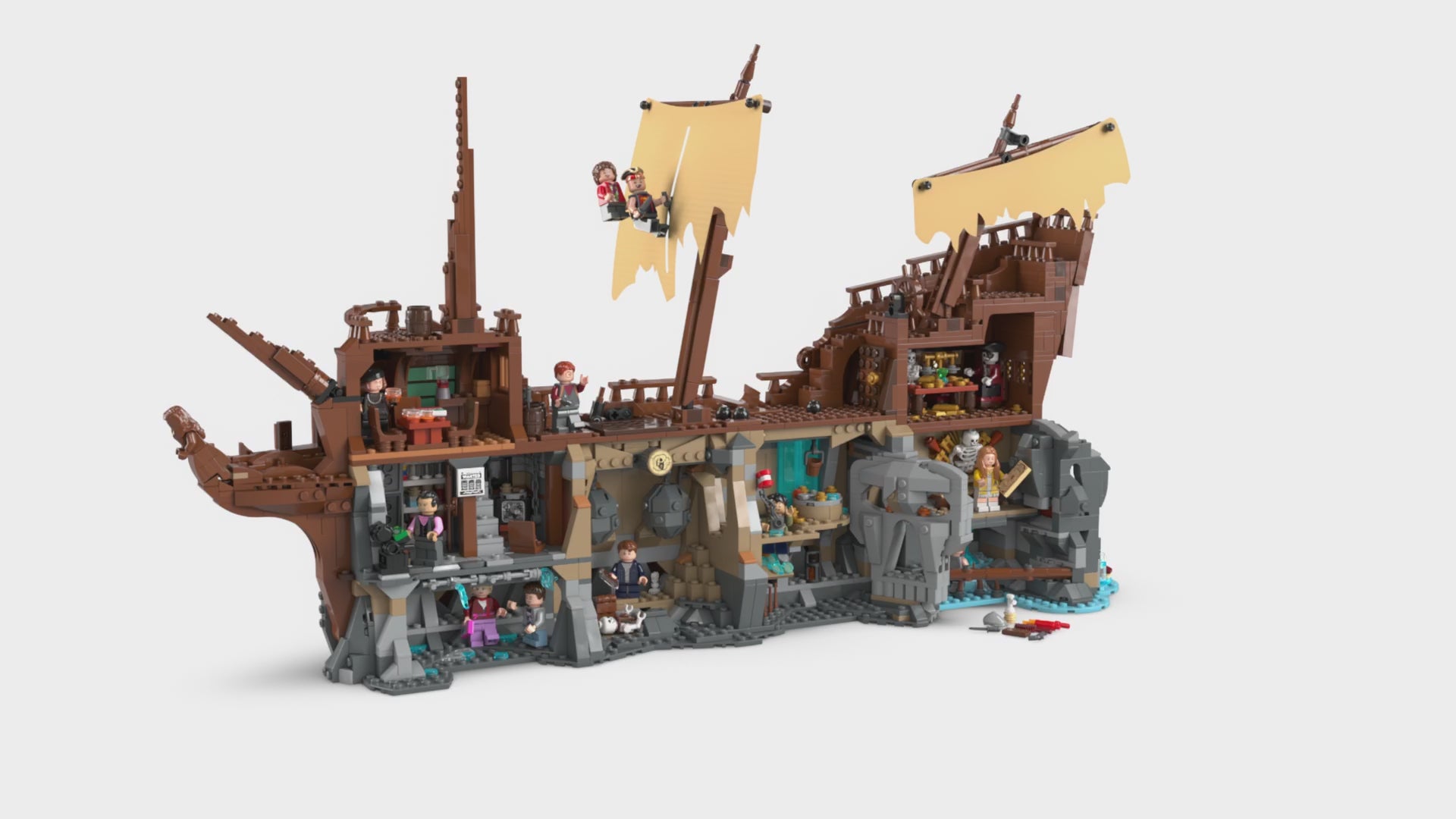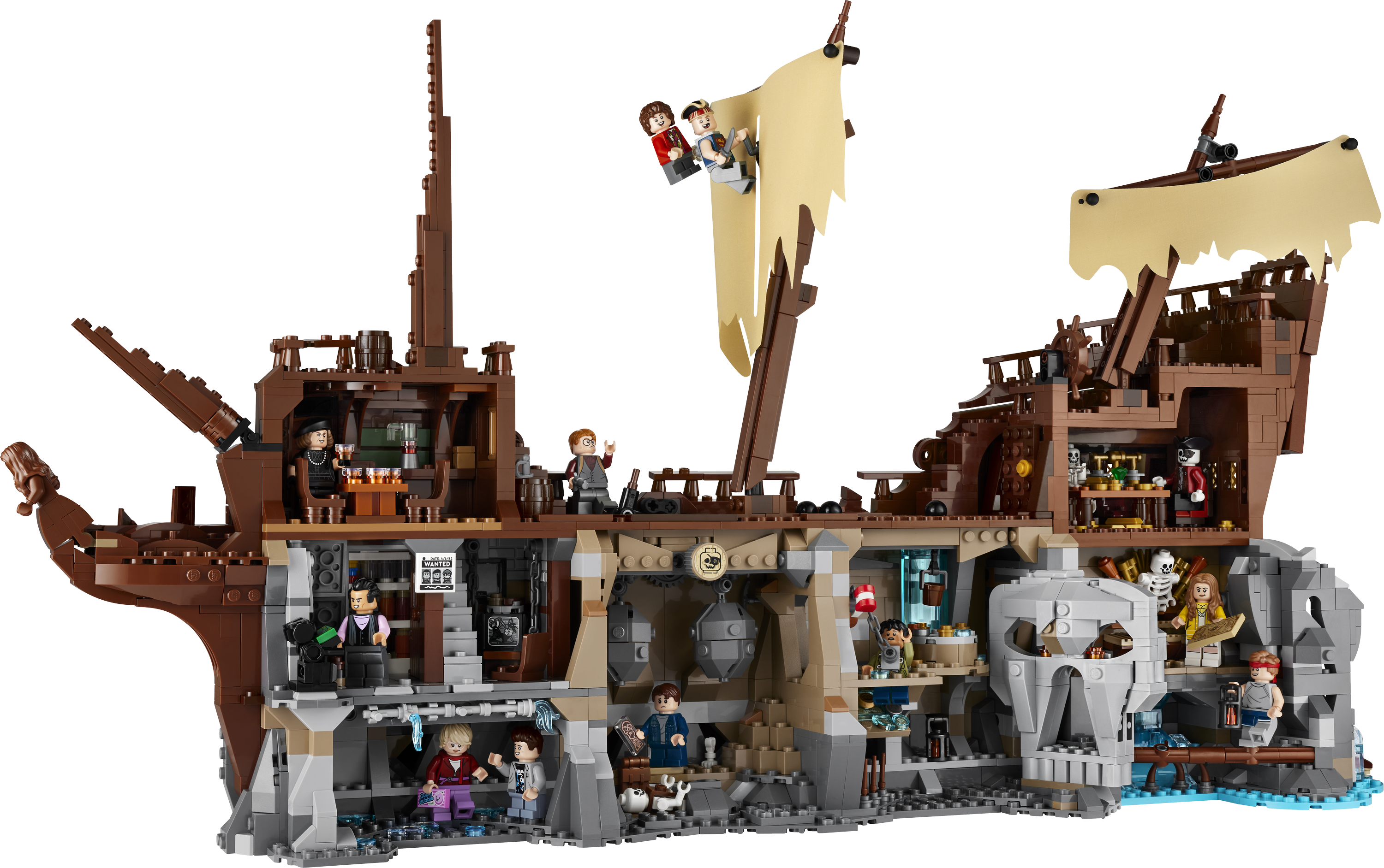 - Iconic scenes – Build the Fratellis’ hideaway and basement, Willy’s treasure room and more cave scenes on one side of the model, and Inferno pirate ship ruins on the other