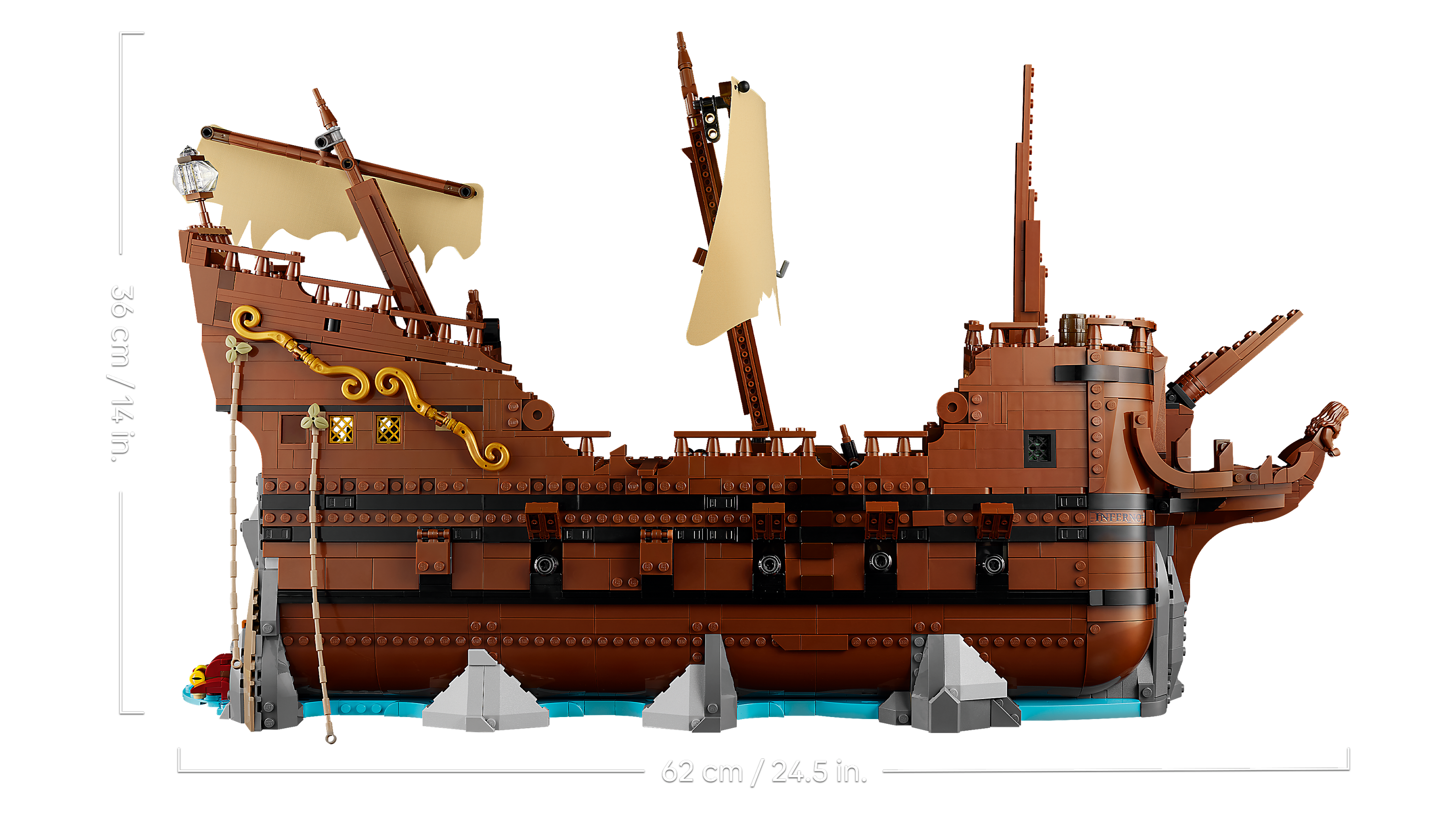 - Dimensions – The pirate ship-shaped model in this 2,912-piece building set measures over 36 cm (14 in.) high, 62 cm (24.5 in.) long and 18 cm (7 in.) wide and makes fun movie-themed decor