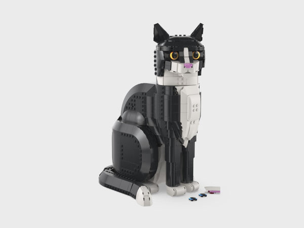 - A lifelike LEGO® brick-built tuxedo cat model for playful home decor