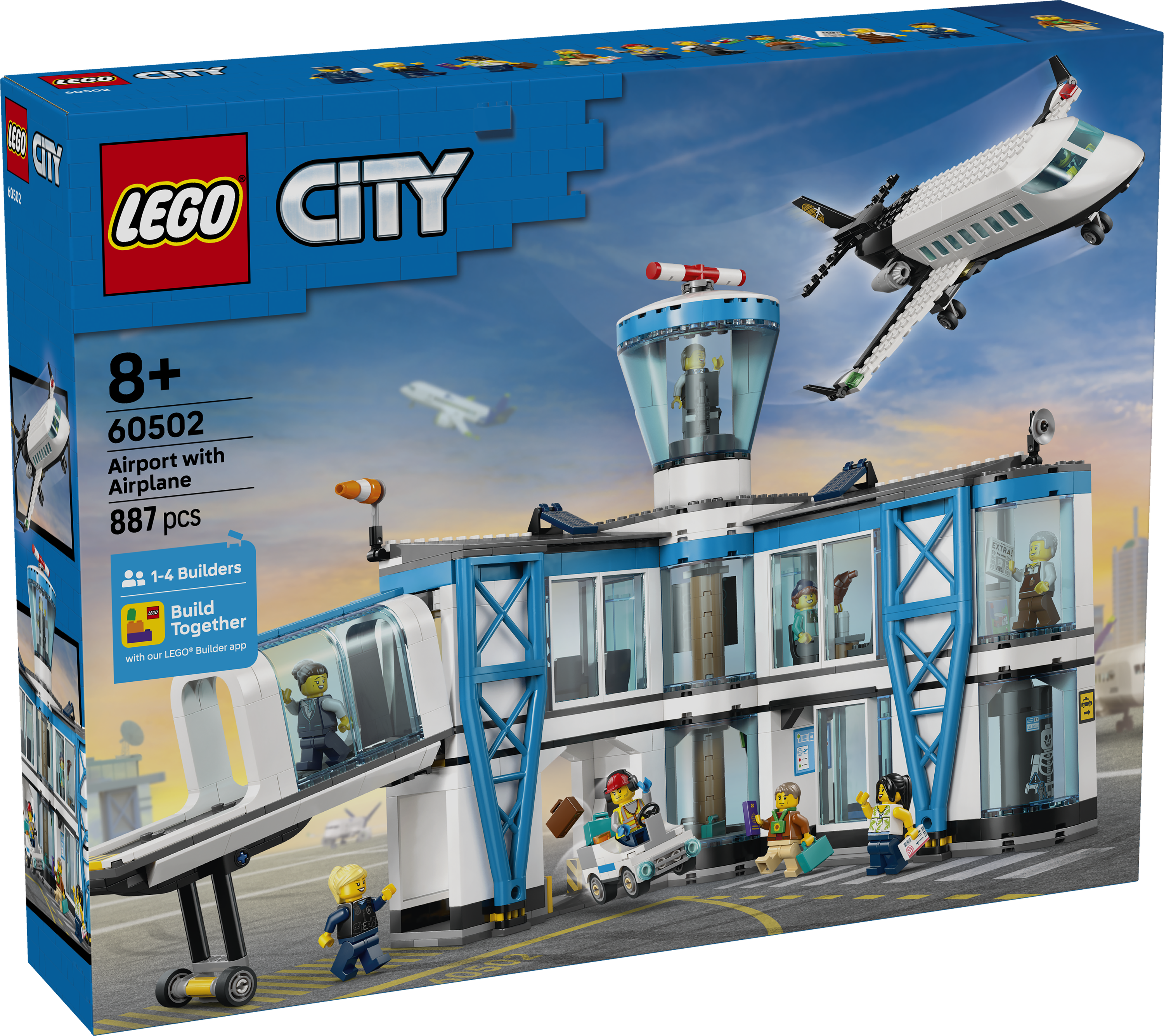 Playtime will take flight with the LEGO® City Airport with Airplane (60502) building kit for kids ages 8 and up. This detailed model airport is packed with features for pretend play. Kids can pass luggage through the toy scanner, rotate the walk-through metal detector to reveal an X-ray skeleton and change the departure display to offer a choice of 4 destinations. The set also includes a cool toy passenger airplane with a detailed cabin and fold-down stairs, plus an airport tug and a jet bridge. Just add the 9 minifigures for hours of imaginative play. This airport toy makes a great gift idea for boys, girls and kids who love model airplanes and LEGO building sets. Add it to other sets (sold separately) from the LEGO City range for even bigger adventures. Team up with friends and family with Build Together mode in the LEGO Builder app, where everyone has fun building part of the set using their own devices. Set contains 887 pieces.