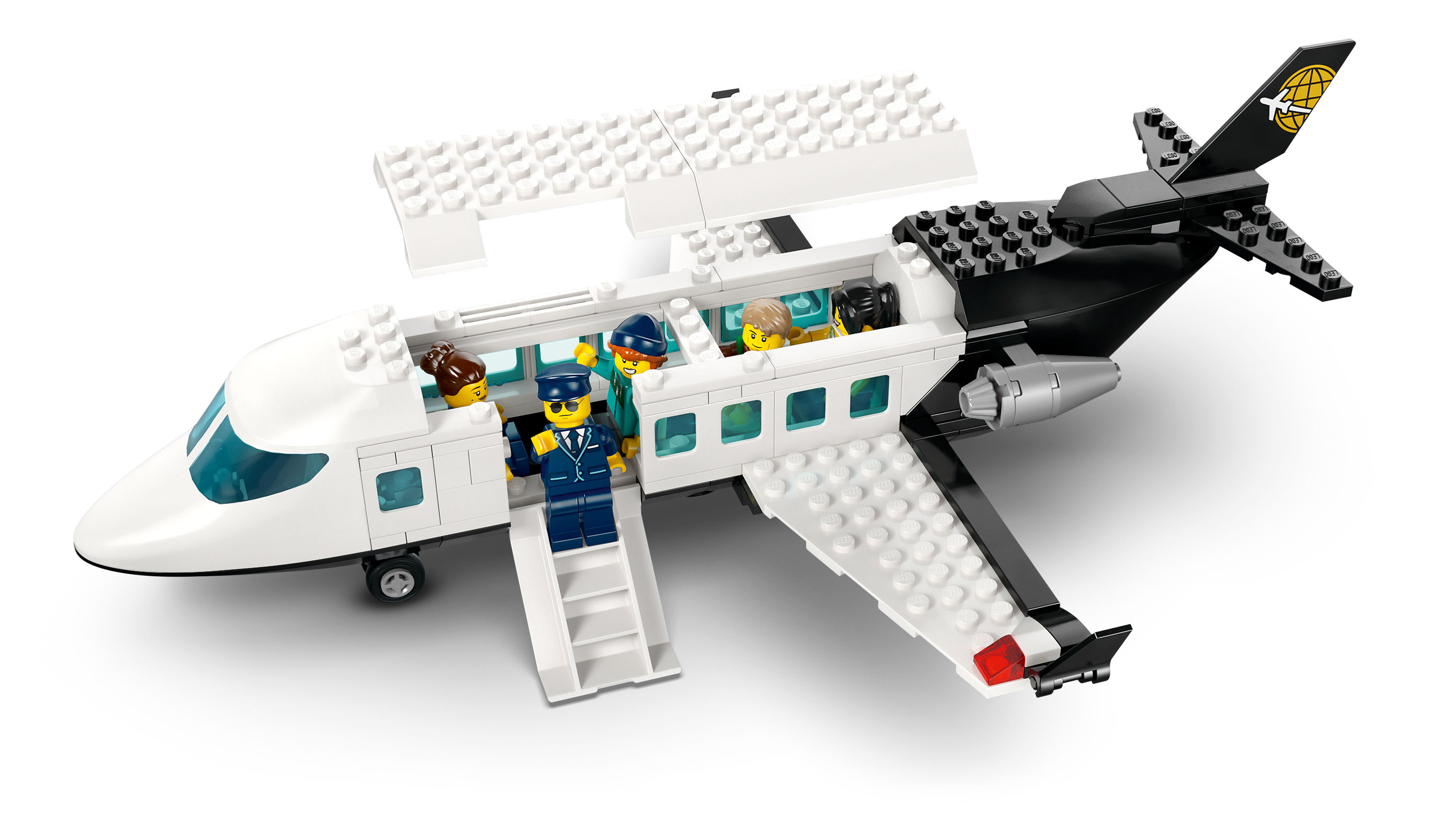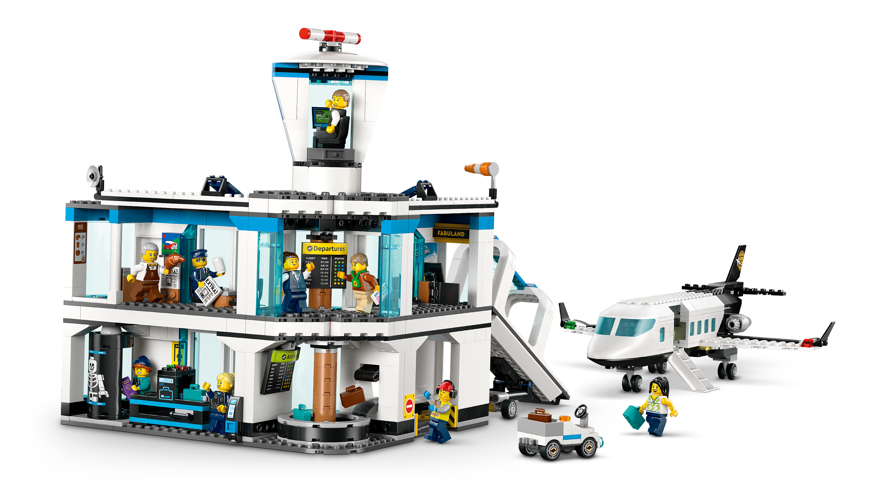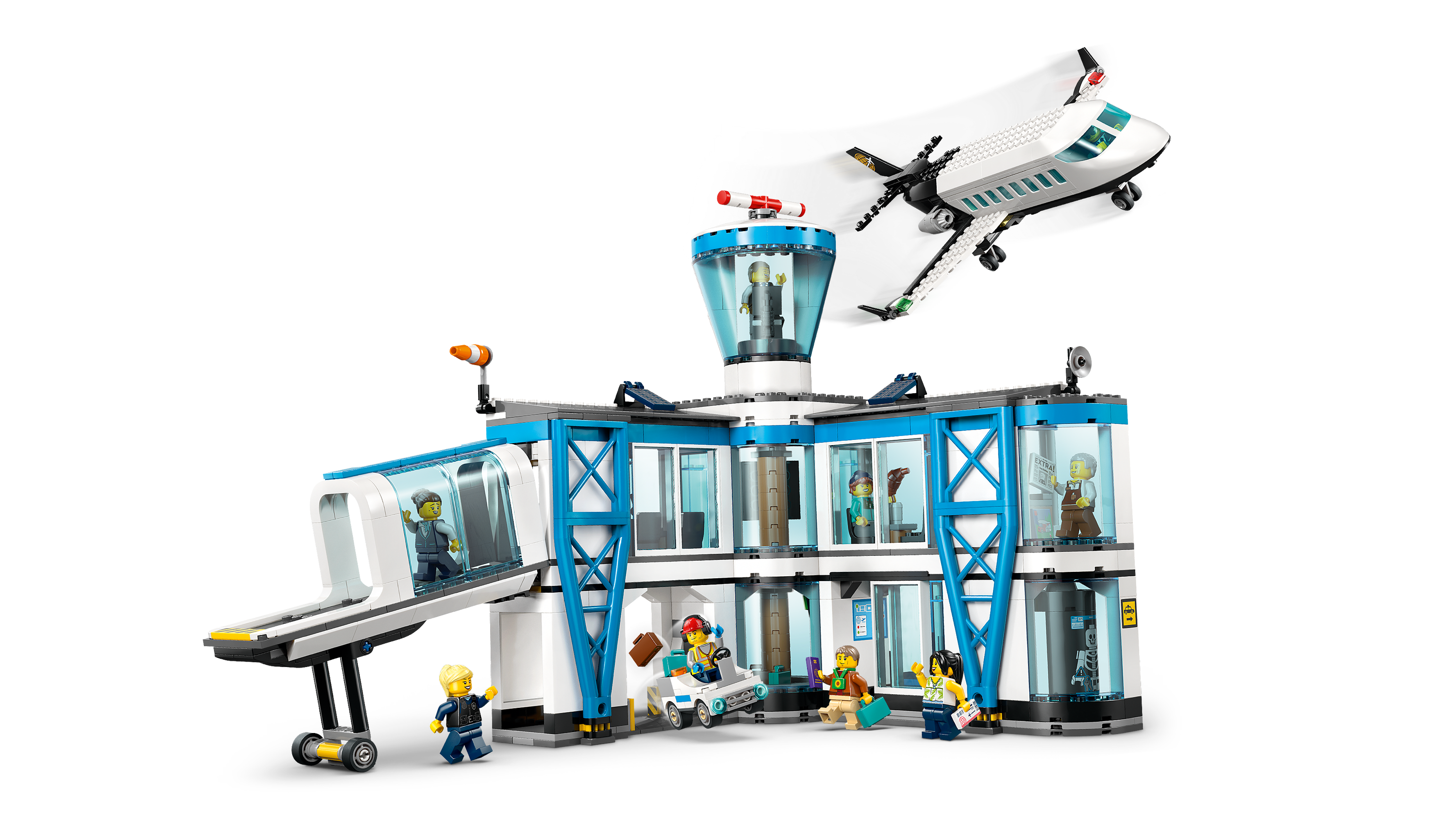 • Model airport with passenger airplane, jet bridge, airport tug and 9 minifigures