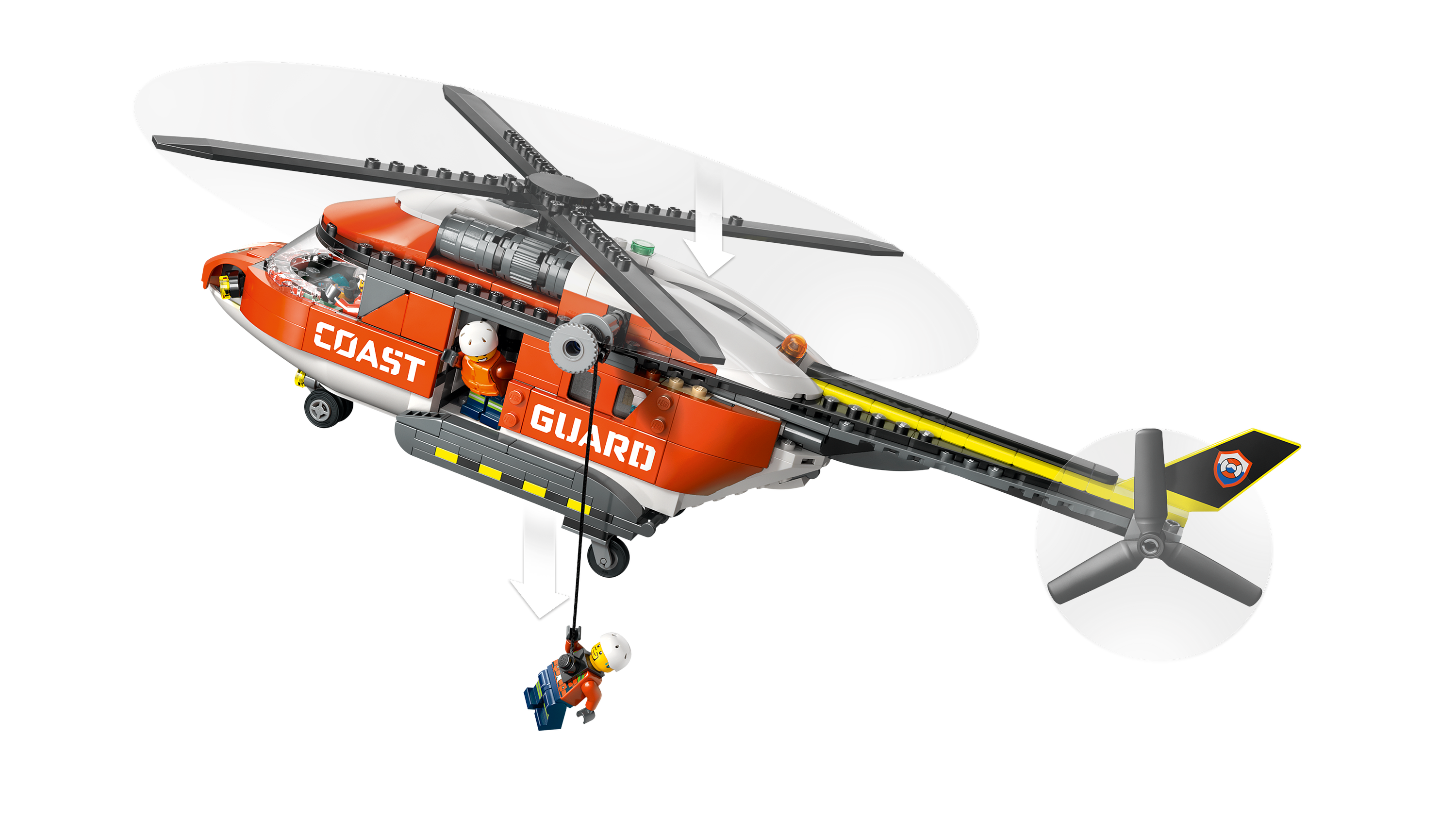 • Kids can use the toy helicopter winch to lower the capsule or a rescue worker