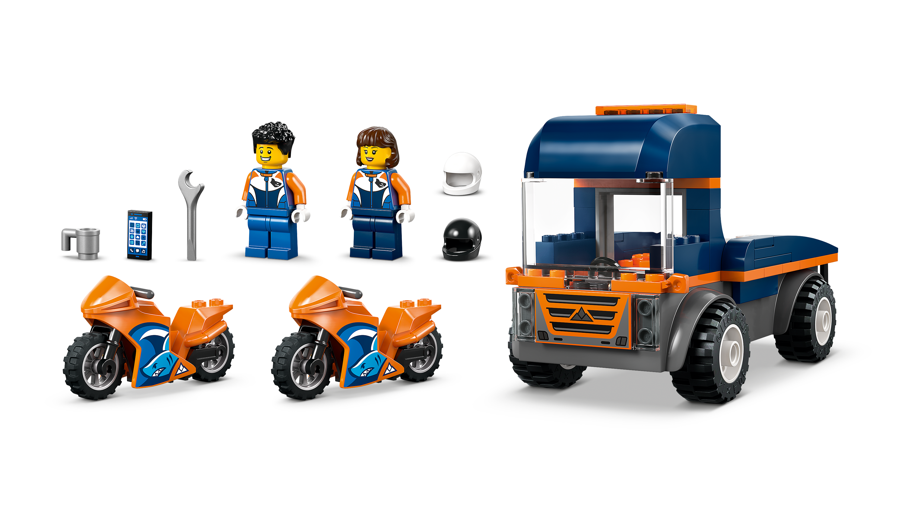 • Includes 2 model motorcycles, a flatbed truck toy and 2 minifigures