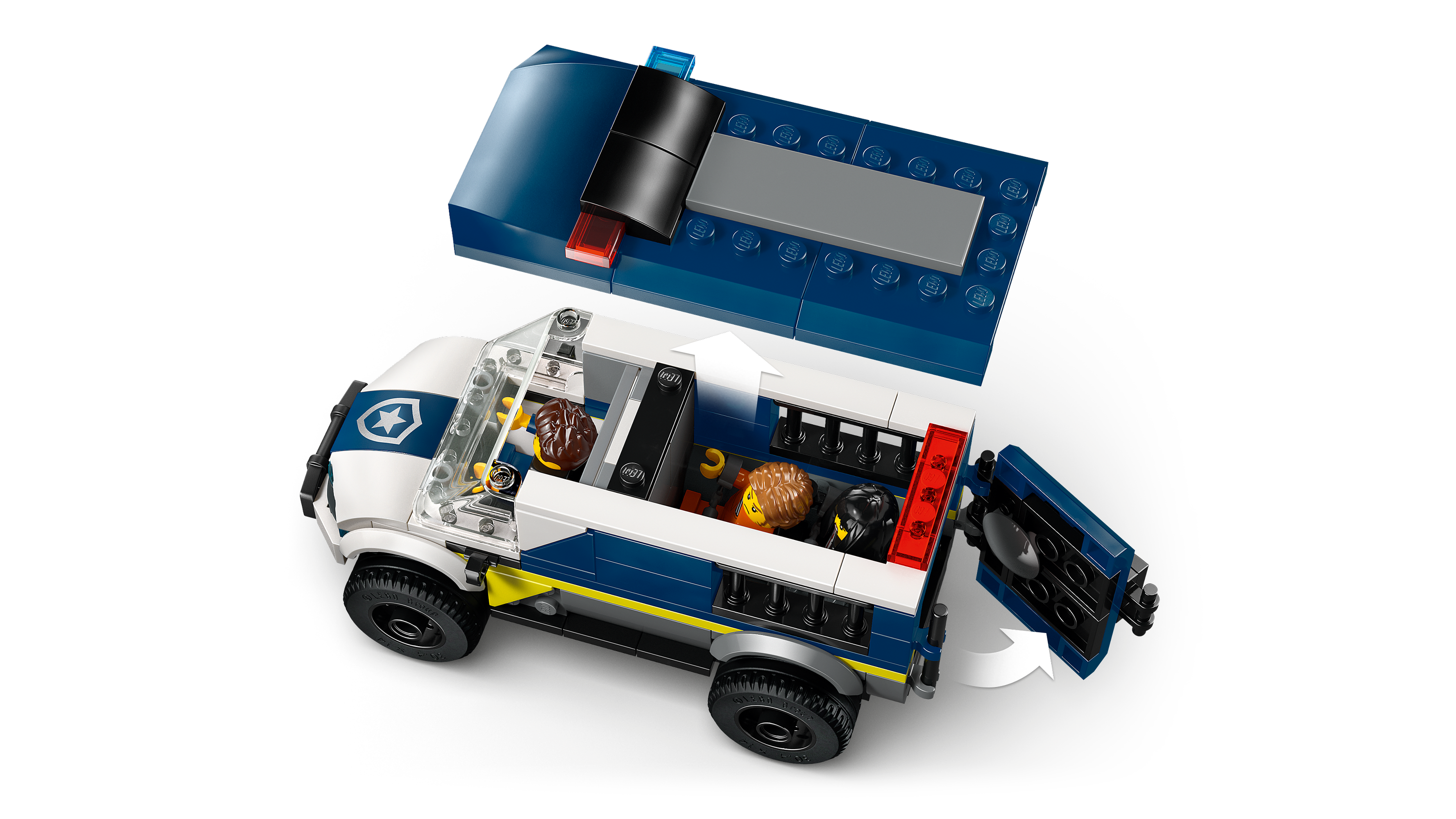 • JAILBREAK ESCAPES – Kids can put the police driver minifigure in the toy van, lock crooks in the onboard cell and use the model motorcycle hook to pull off the cell door for epic escape action