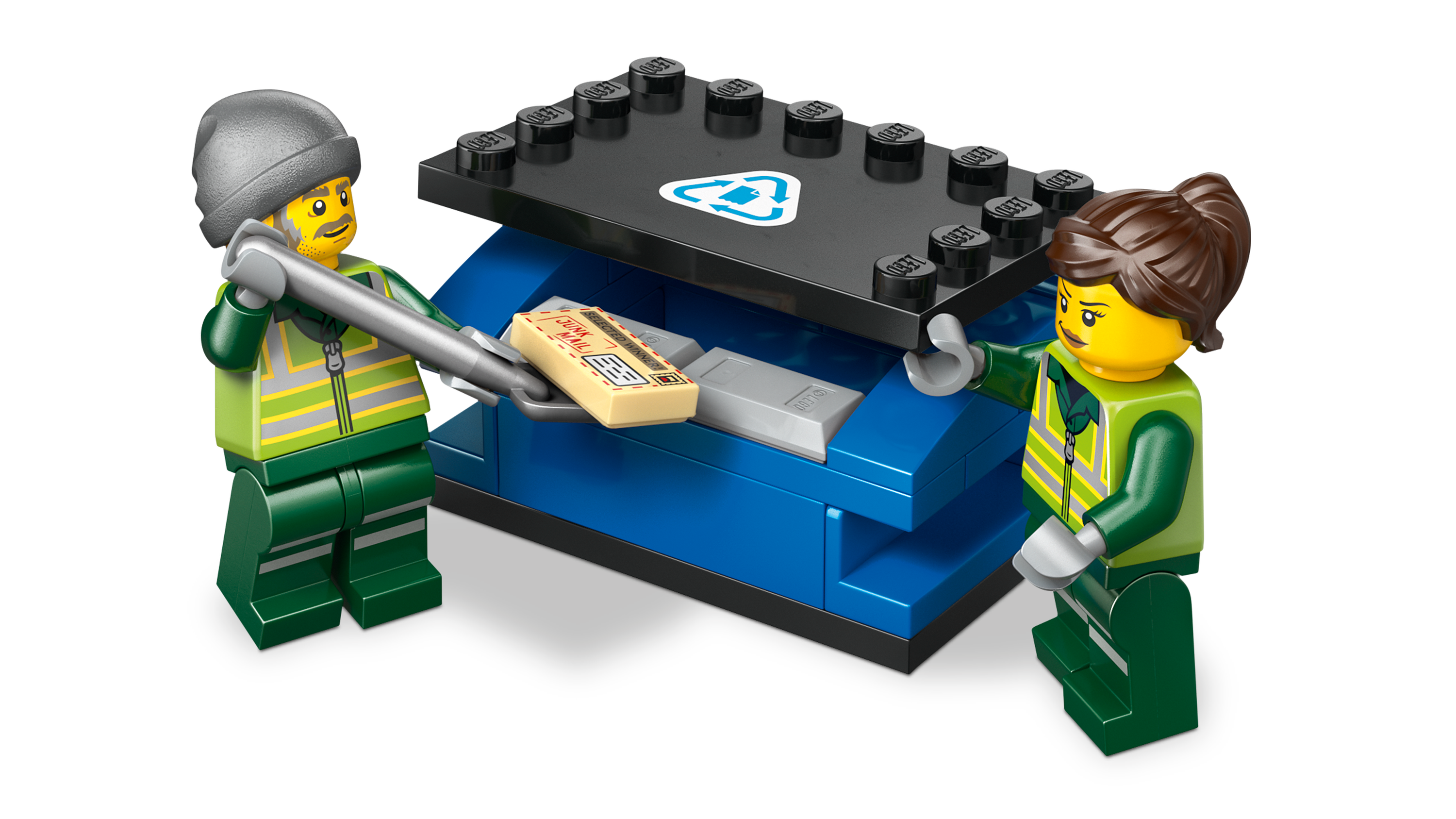 • Model truck building kit with 2 recycling dumpsters and 2 minifigures