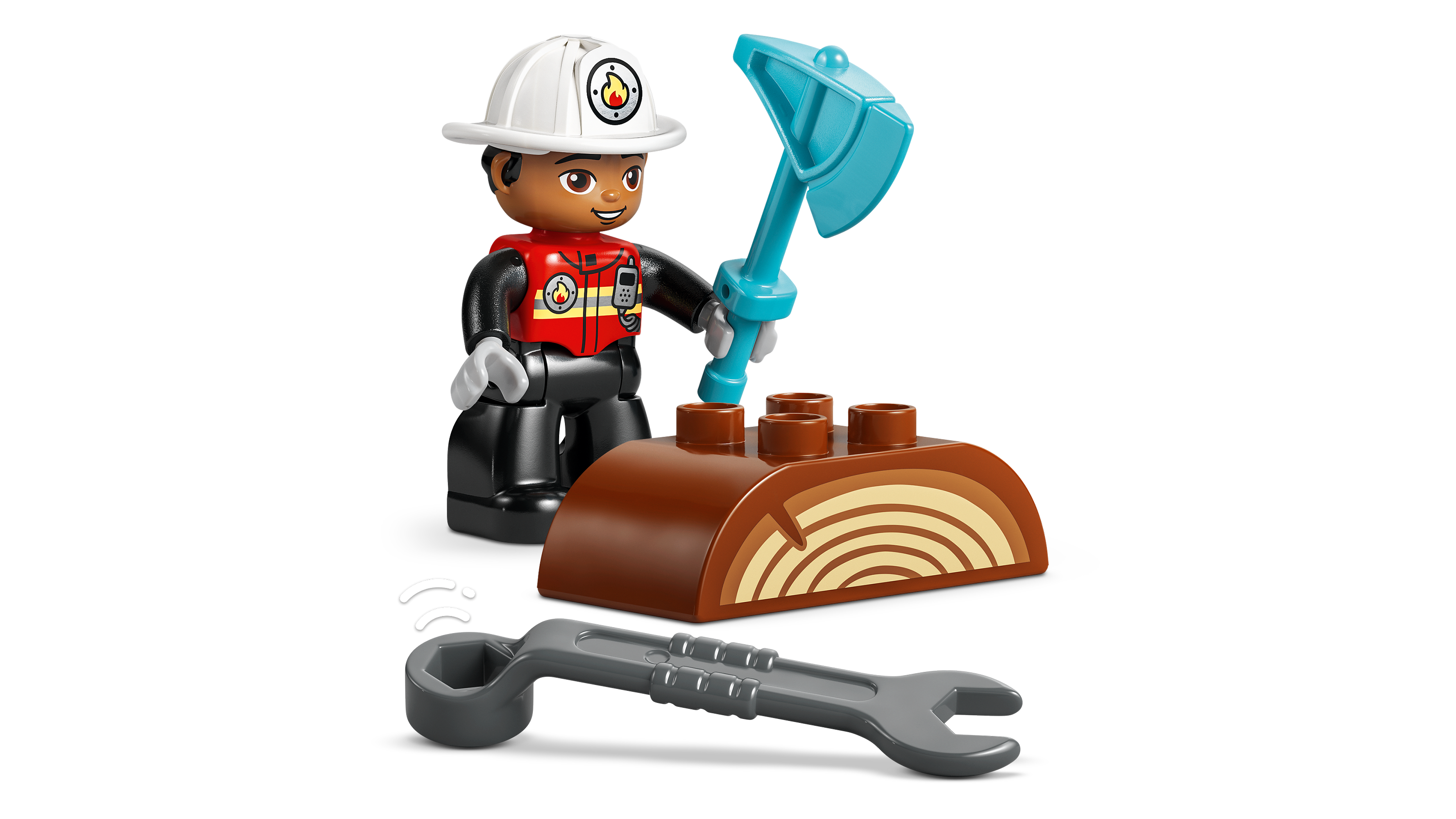 • Pretend play toy comes with a firefighter figure, an axe and a wrench