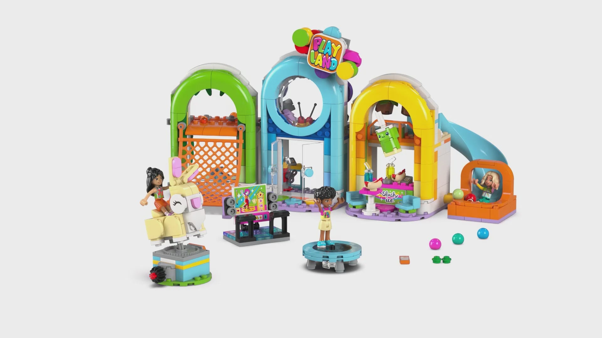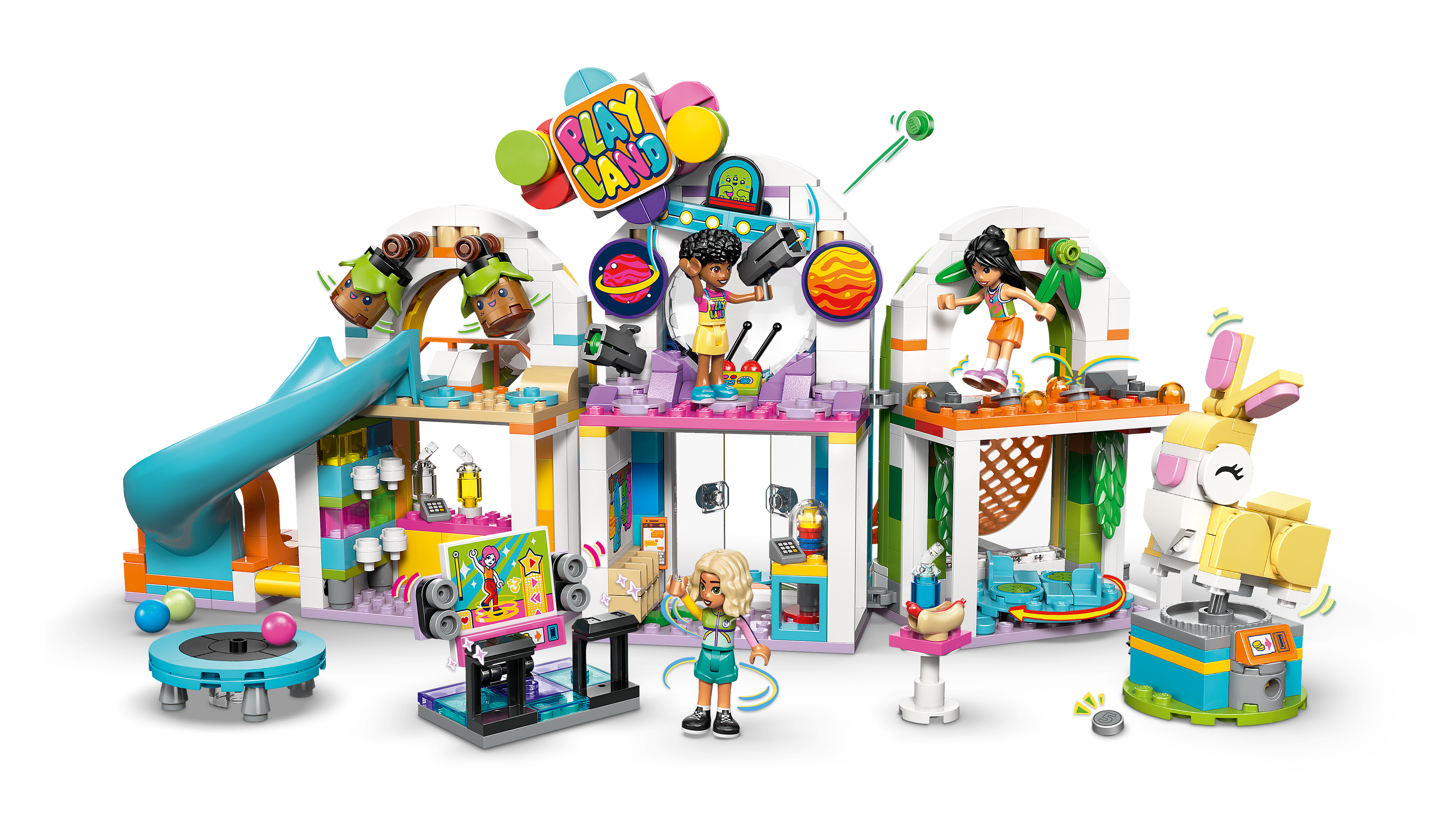 • LOTS OF ACCESSORIES – Fuel storytelling with slushies, hot dogs, a phone, a gumball machine, cash registers, a coin, plus a side build with a dance machine, a trampoline, a jumping bunny ride and more