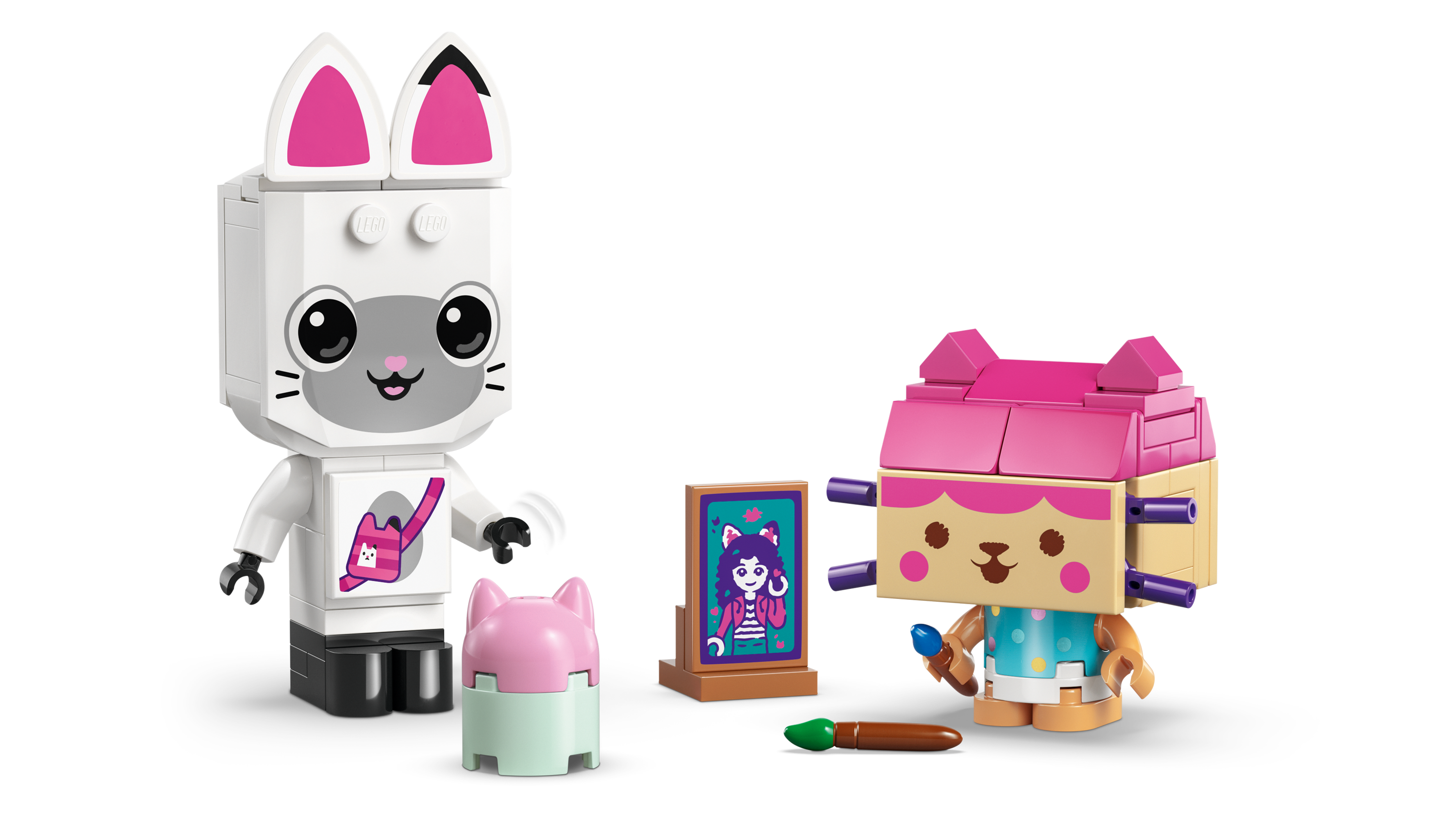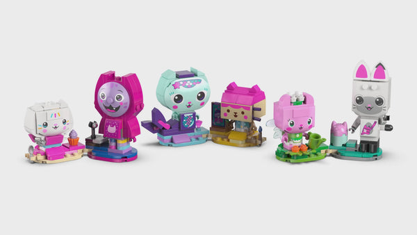 Create, play and display with LEGO® Gabby’s Dollhouse Gabby’s Brick-Built Cat Friends: MerCat, ‘DJ’ Catnip, Cakey, Pandy Paws, Kitty Fairy and Baby Box.Key Features