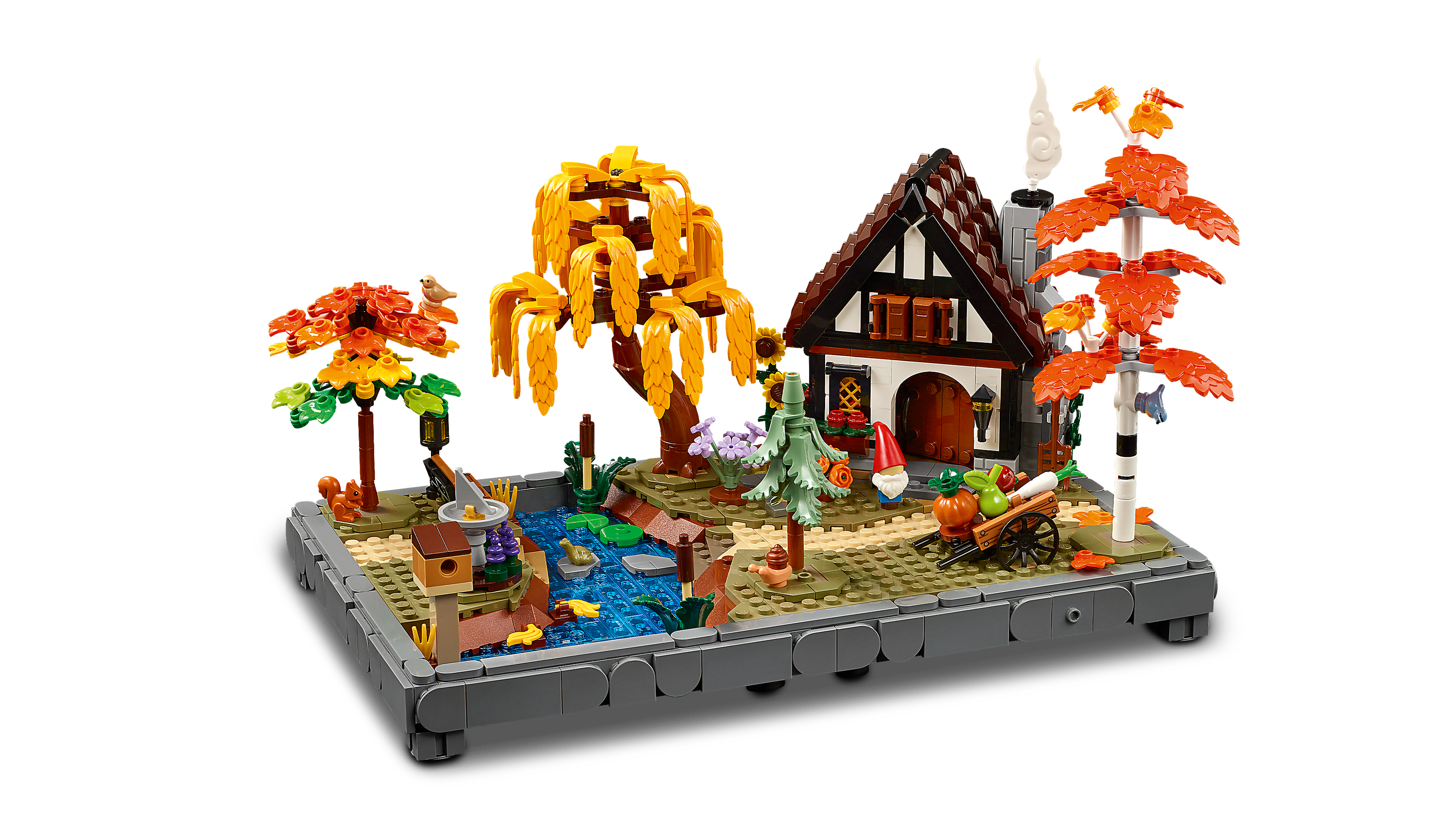 Capture the essence of fall with the LEGO® Icons Autumn Cottage Garden (11372) model building kit for adults. Craft a seasonal centerpiece bursting with fall colors. Unwind as you build each intricate detail, then rearrange the trees, plants and cottagecore decor elements to create a vibrant display for the home or office. Inspired by storybook cottages, this addition to the Gardens of the World collection features birch, weeping willow, blue spruce and maple trees, plus seasonal flowers. Other highlights include a sundial, birdhouse, vegetable cart, a garden gnome and a stream with stepping stones. A cottage with a cozy kitchen and woodland creatures including robin and nuthatch birds, a squirrel, frog, and snail add the final touches to this model – a perfect gift for adult fans of creative home decor. Build smarter with the LEGO® Builder app – zoom, rotate in 3D, track your progress and follow step-by-step digital instructions. Contains 1,102 pieces.