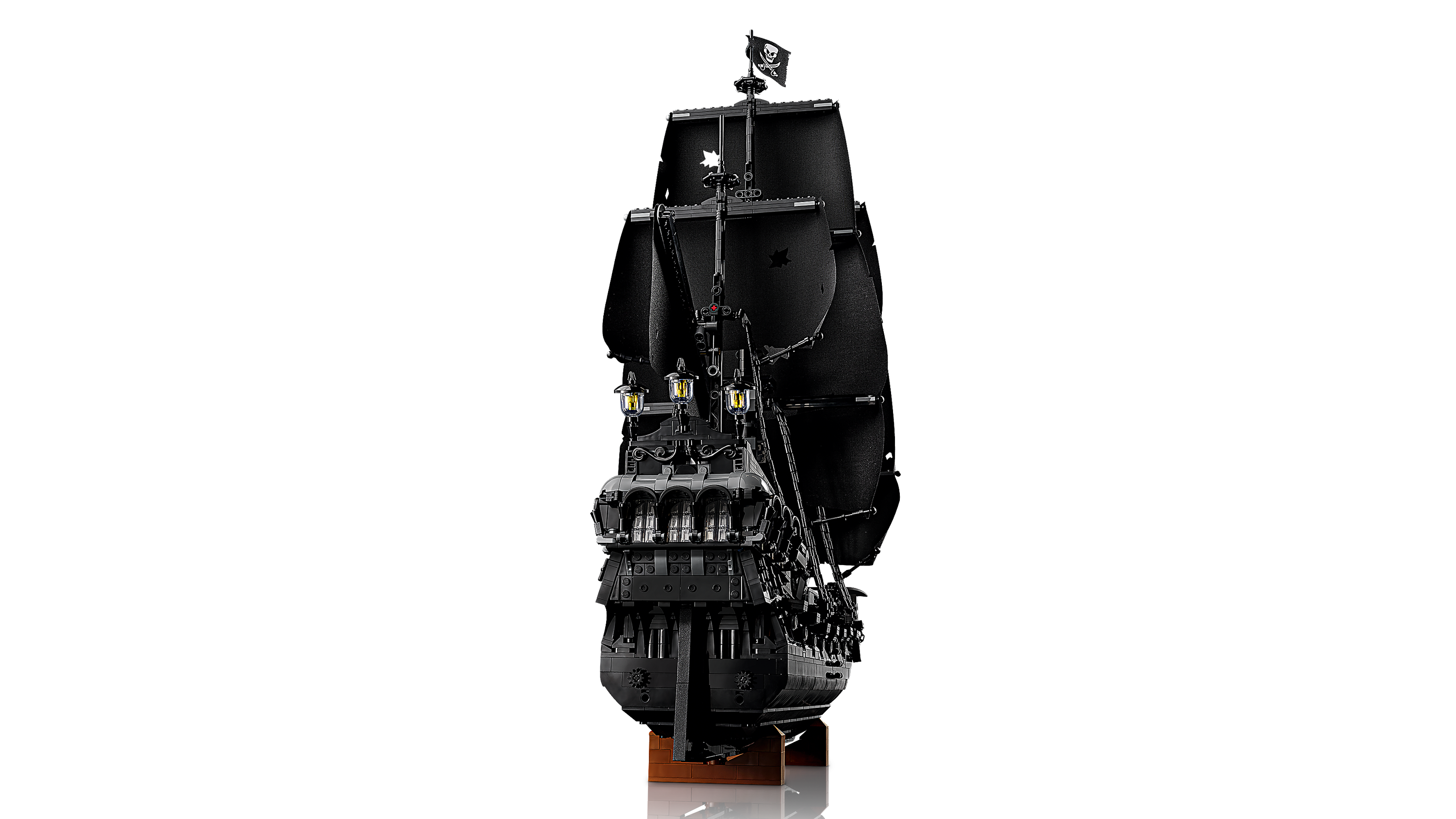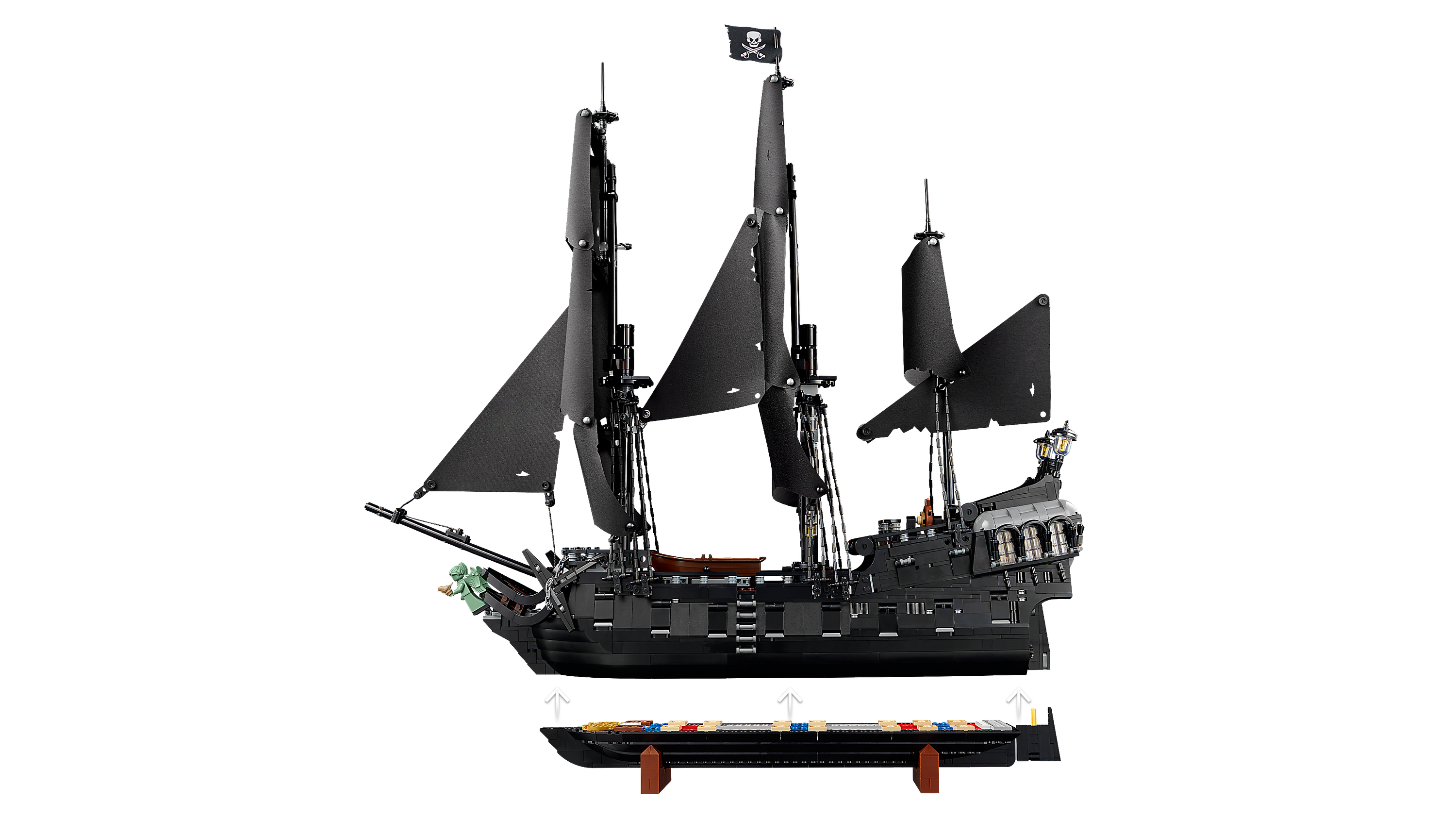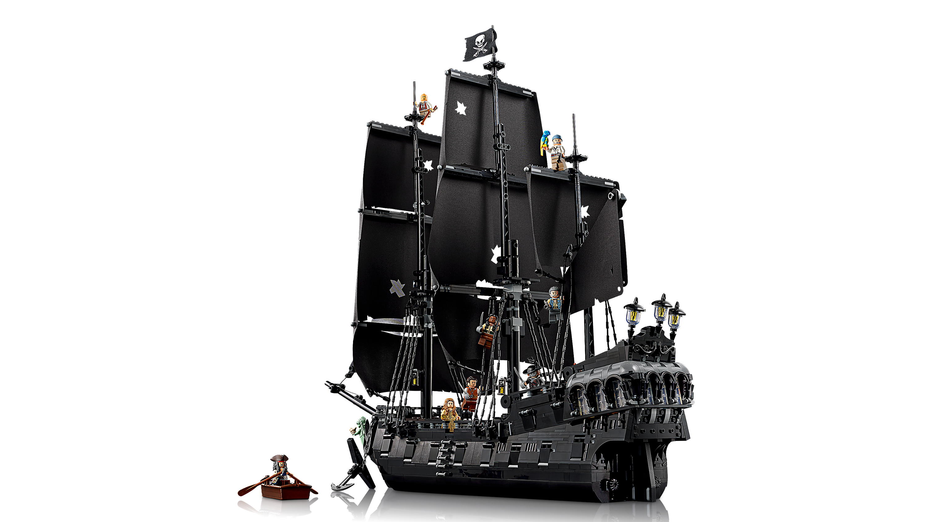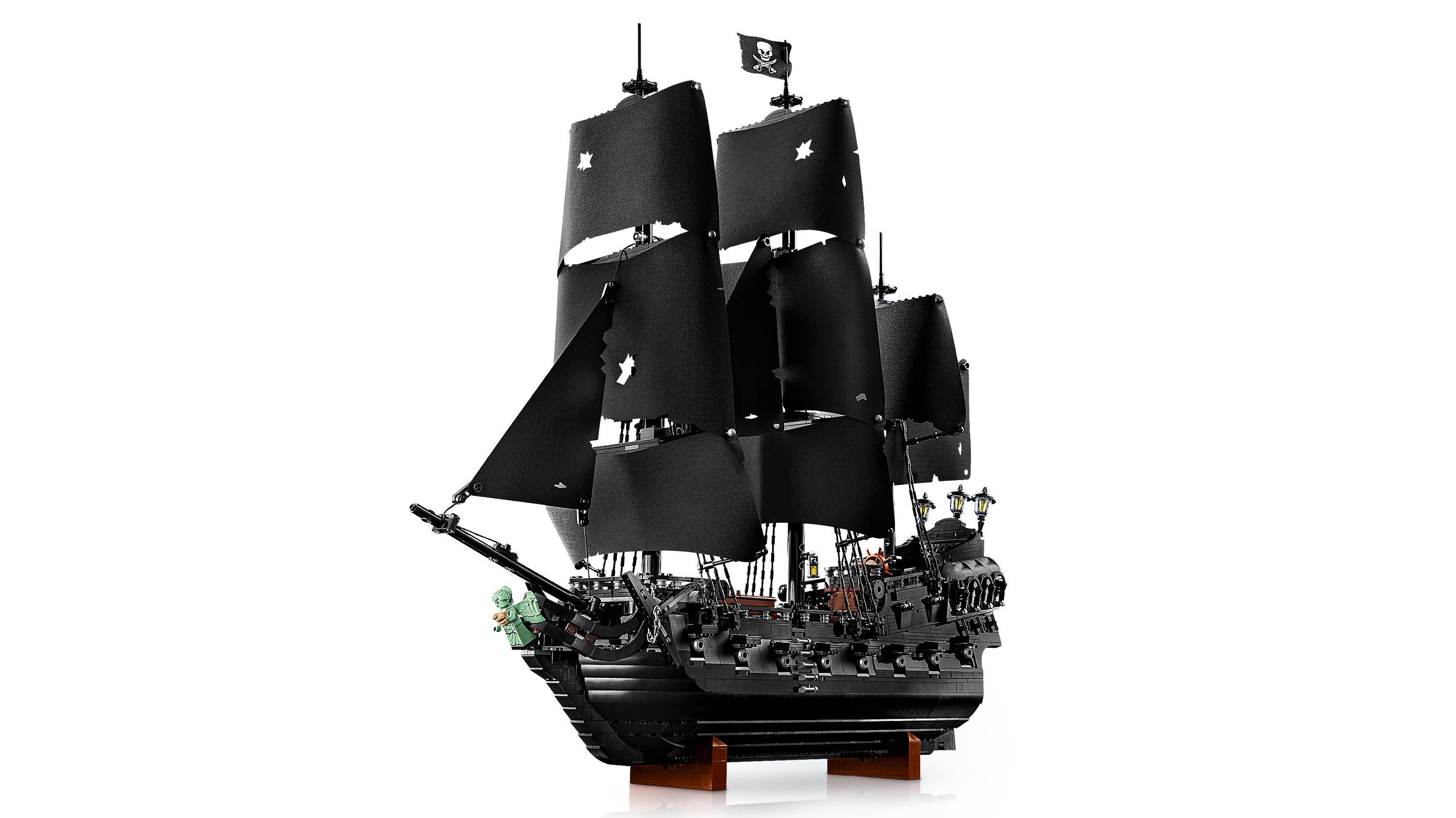 This film replica model captures the ship in all its glory. Rotate dials to deploy the port or starboard cannons, turn the ship’s wheel to steer the rudder and open the deck to reveal the captain’s quarters with furnishings, candlesticks and an apple. Additional features include a detachable rowing boat, a figurehead minifigure and a versatile stand for angled display. Alternatively, the hull can be split at the waterline to depict the ship in sailing mode.