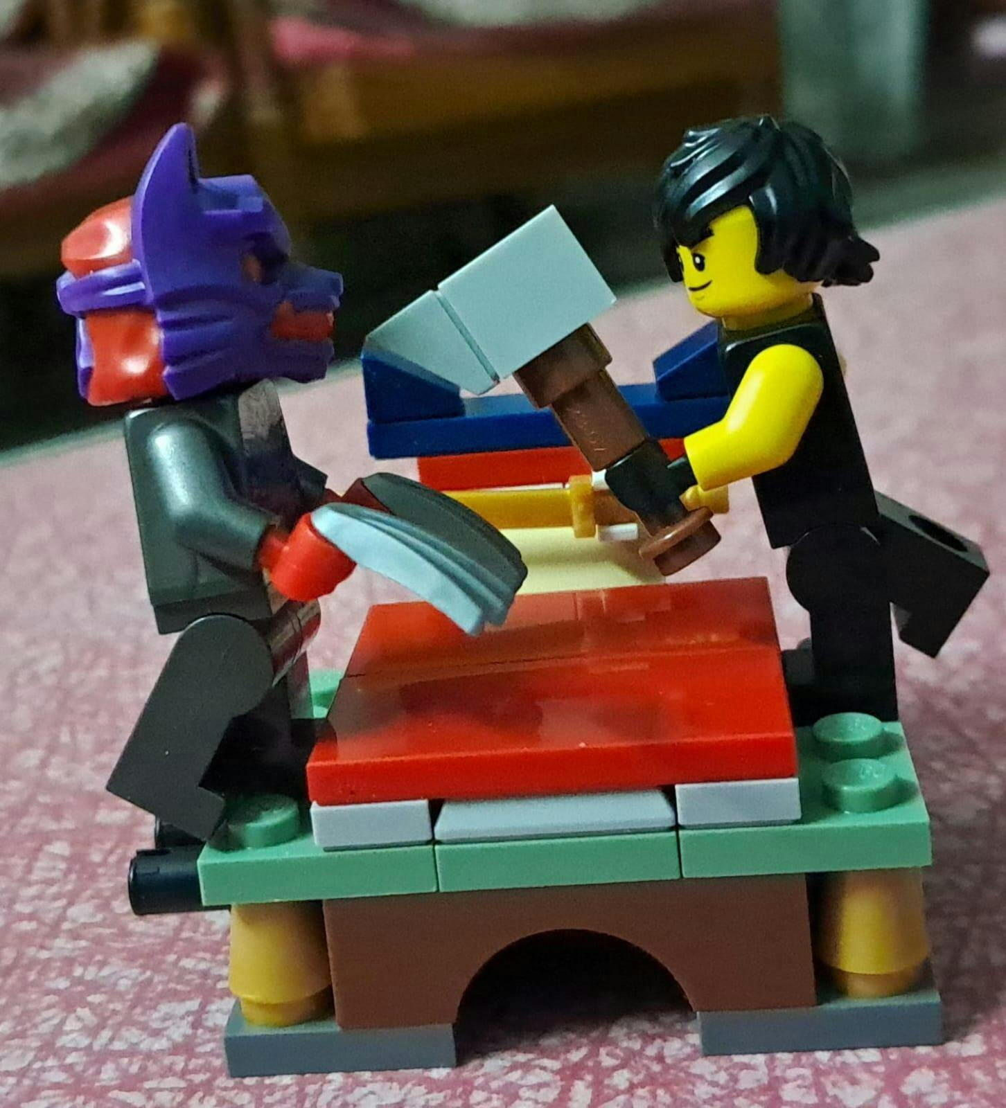 Ninja playset lets kids role-play battles between Cole, armed with a katana sword accessory, and a Wolf Mask Warrior with its claws to win a golden staff.